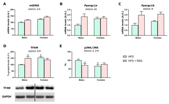 RSG and sex effects on hepatic mitochondrial biogenesis. (A) mtDNA—mitochondrial DNA, gene expression analysis of (B) Ppargc1α—peroxisome proliferator-activated receptor gamma coactivator 1-alpha and (C) Ppargc1β—peroxisome proliferator-activated receptor gamma coactivator 1-beta; and Western blot analysis of (D) TFAM protein levels; transcription factor A, mitochondrial; and (E) pJNK/JNK, phospho- and total c-Jun N-terminal kinase. Values are presented as the mean ± SEM (6–7 animals per group). Sex and RSG effects were analyzed by two-way ANOVA (p < 0.05): S—sex effect; R—RSG effect; and S*R—interactive effect. Fisher’s LSD post-hoc test (p < 0.05): (a) vs. HFD rats; (b) vs. male rats.