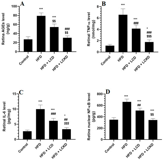 Levels of advanced aged glycation products (AGEs) (A), tumor necrosis factor-α (TNF-α) (B), levels of interleukin-6 (IL-6) (C), and nuclear activity of NF-κB (D) in retinas of all groups of rats. Data are presented as means ± SD for n = 8 rats/group. * and ***: significantly different compared with control at p < 0.05 and p < 0.001, respectively; ## and ###: significantly different compared with HFD-fed rats at p < 0.01 and 0.001, respectively; $$ and $$$: significantly different compared with HFD + LCD-fed rats at p < 0.01 and p < 0.001, respectively. Tumor necrosis factor-α (TNF-α), interleukin-6 (IL-6), and nuclear factor kappa beta (NF-κB).