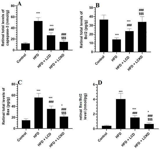 Levels of caspase-3 (A), Bcl2 (B), BAX (C), and Bax/Bcl2 (D) in the retinas of all groups of rats. Data are presented as means ± SD for n = 8 rats/group. * and ***: significantly different compared with control at p < 0.05 and p < 0.001, respectively; ###: significantly different compared with HFD-fed rats at p < 0.001; $$$: significantly different compared with HFD + LCD-fed rats at p < 0.001.