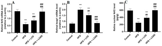 mRNA levels of Nrf2 (A) and Keap1 (B), and nuclear levels of Nrf2 (C) in retinas of all groups of rats. Data are presented as means ± SD for n = 8 rats/group. ***: significantly different compared with control at p < 0.001; ## and ###: significantly different compared with HFD-fed rats at p < 0.01 and p < 0.001, respectively; $$$: significantly different compared with HFD + LCD-fed rats at p < 0.001.