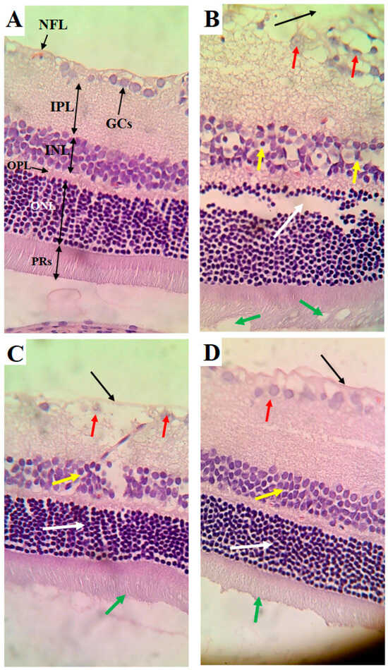 The histological protocol was routinely performed in our laboratories [42]. The retina tissue samples were fixed for 24 h in 10% buffered formalin and were then treated with ethanol, embedded in paraffin, and cut using a microtome in sections of 3–5 μm. They were then routinely stained with H&E and were examined and photographed under a light microscope.