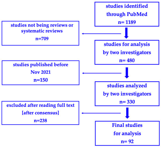Our search strategy in the PubMed database initially identified a total of 1189 records. After setting as screening filters the terms “review” or “systematic review”, 709 publications were excluded; following the next filter, relating to the publication time frame [1 November 2021 to 30 June 2024], another 150 were excluded, leaving 330 for analysis. These studies were initially screened by two authors, independently, and in the case of discrepancy, by a third. Finally, 92 articles remained to be analyzed after the exclusion of a further 238. The search outcome is displayed as a flowchart in Figure 1.