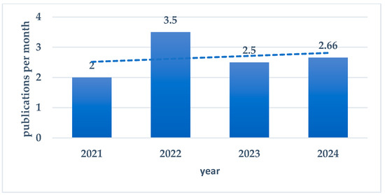 The search covered a 32-month period, beginning in November 2021, the date of the publication of the consensus formally defining the term “postbiotics” [8]. In total, 92 review articles were found to be eligible for analysis; four were published in 2021, 42 in 2022, 30 in 2023, and 16 in 2024 [up to the end of June]. The monthly publication rate per year is presented in Figure 2.