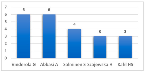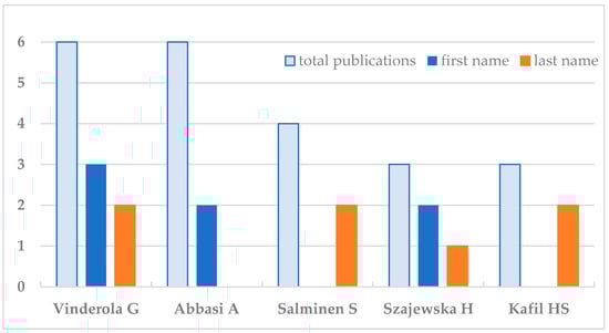 The 92 papers have a total of 488 authors. Of these—regardless of the authorship rank—Vinderola G, from Argentina, and Abbasi A, from Iran authored six papers each—which means their names were found six times within the 488 authors—Salminen S, from Finland, four, and Szajewska H from Poland, and Kafil H from Iran, three papers each (Figure 3). Additionally, another 21 scientists authored two papers each. This means that 456 scientists authored in collaboration with others, one or more of the 92 articles.