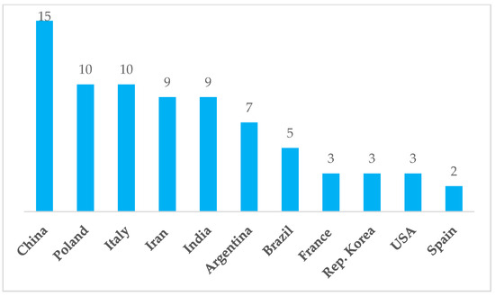 According to the country of residence and work of the first authors, eleven countries had the greatest productivity—76 articles—contributing two or more papers each; thus, 76 publications came from 11 countries and the remaining 16 were from another 16 countries. China was top with 15 publications, followed by Italy and Poland with 10, and India and Iran with 9 (Figure 5).