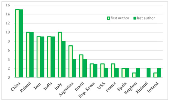 The last authors came from 32 countries, fourteen of which had the greatest productivity—74 articles—contributing two or more papers each, and the remaining 18 publications came from another 18 countries. As a consequence of the collaboration among countries, there is a slight difference in the rank of countries from which the last authors came in relation to that of the first authors. The country with the highest productivity was China again, with 15 publications [rate 16.3%], followed by Poland with 10 [rate 10.9%], India and Iran with 9 [rate 9.8%] each, Italy with 8 [rate 8.7%], and Argentina and Brazil with 4 each [rate 4.3%]. The number of studies per country is presented in Figure 6 along with the first and last authors for each country.