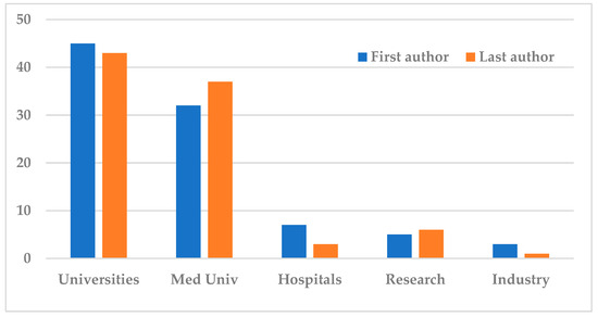The first authors of the 92 publications were affiliated with universities [n = 45], medical universities [n = 32], hospitals [not related to medical schools, n = 7], independent research centers [n = 5], and industry [n = 3] (Figure 8).