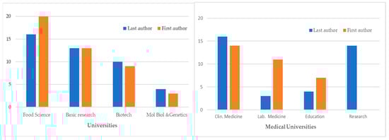 Regarding last authors, the 43 articles that came from non-medical universities were from departments dealing with food science [n = 16, including one in Dairy Science], basic research [n = 13], biotechnology [n = 10], and molecular biology and genetics [n = 4]. The 37 papers from medical universities were from clinical [n = 16] and laboratory medicine [n = 3], from research [n = 14], as well as another four from student research. The three articles from non-university hospitals came from departments of pediatrics, emergency medicine, and geriatrics. Finally, six articles from research laboratories—not affiliated with universities—were from biochemistry [n = 2], biotechnology [n = 1], immunology [n = 1], and food science [n = 2] departments, while one article, that came from industry, was related to research in dermatology (Figure 9, Table 2).