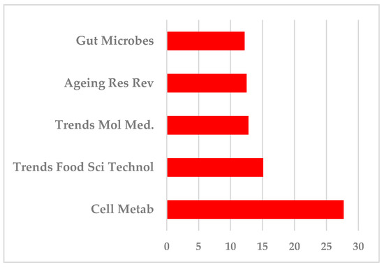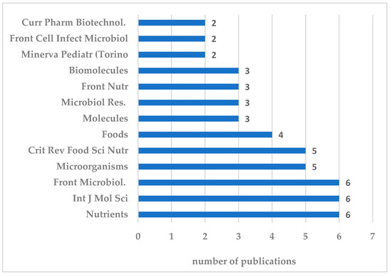 The 92 articles were published in 51 journals: thirteen journals hosting more than half of the publications, [n = 50, rate 54.3%]. Int. J. Mol. Sci., Nutrients, and Front. Microbiol. were ranked first in frequency, with six publications each; followed by Crit. Rev. Food Sci. Nutr. and Microorganisms, with five publications each (Figure 10).