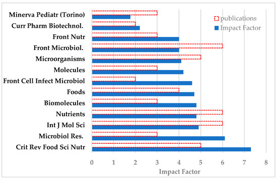 Among the 13 journals hosting the 50 articles, Crit. Rev. Food Sci. Nutr., with five publications, has the highest IF of 7.3, followed by Microbiol. Res. with three publications and an IF of 6.1, next are Int. J. Mol. Sci. with 4.9 and Nutrients with an IF of 4.8—six publications each (Figure 11). All IFs were correct as of August 2023.