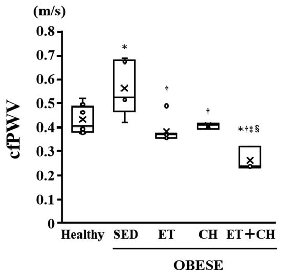 | cfPWV (m/s) | 0.43 ± 0.02 | 0.56 ± 0.05 * | 0.38 ± 0.02 † | 0.40 ± 0.01 † | 0.26 ± 0.03 *†‡§ |