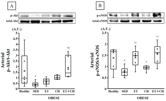 | p-eNOS/t-eNOS (A.U.) | 1.38 ± 0.21 | 0.76 ± 0.09 * | 1.39 ± 0.16 †‡ | 0.93 ± 0.05 * | 1.55 ± 0.18 †‡ |