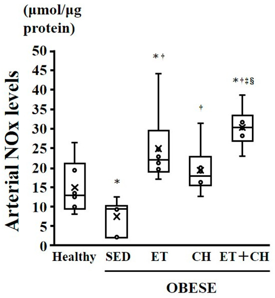 | Arterial NOx levels (μmol/μg protein) | 14.8 ± 2.8 | 7.4 ± 1.8 * | 24.8 ± 4.0 *† | 19.2 ± 2.6 † | 30.2 ± 2.1 *†‡§ |