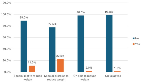 Regarding the measures by the adolescent girls of their body image maintenance, 22.5% were on special exercise to reduce their weight and 11.0% were on special diets to reduce their weight (Figure 1).
