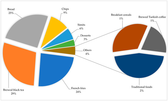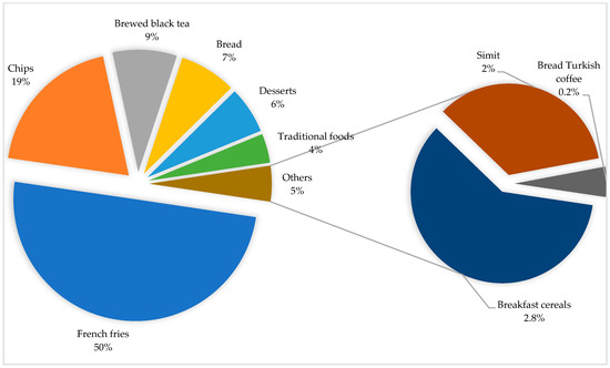 In this study, information on the consumption of bread (180 g/day), French fries (93.6 g/day), brewed black tea (416 mL/day), and brewed Turkish coffee (26 mL/day) was obtained from the Türkiye Nutrition and Health Survey [36]. However, there is no defined data on the consumption of desserts, traditional foods, chips, simits and breakfast cereals by individuals living in Türkiye. Therefore, the consumption amounts of these foods were determined by evaluating the portion amount defined on the packaging of the relevant foods or the consumption trends of these foods. Accordingly, the amount of portion consumed were accepted as 130 g, 100 g, 25 g, 60 g and 40 g for desserts, traditional foods, chips, simits and breakfast cereals, respectively.