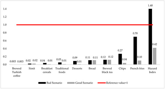 Since individuals consume not only one food but many foods together in their daily lives, the cumulative health risks of acrylamide exposure from all foods were also examined in this study. The hazard index levels were determined as 0.42 and 1.40 for the good and bad scenarios, respectively. Therefore, the good scenario is reliable in terms of non-carcinogenic health risks. The bad scenario carries potential health risks. In the bad scenario, the daily consumption of foods with high acrylamide levels, especially French fries and chips, caused both the THQ values of the foods and the HI (total THQ) values to increase.