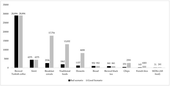 Two different scenarios (good and bad scenarios) of consumption of these foods by the Turkish society were determined. In the good scenario, the consumption amounts of bread, brewed black tea and brewed Turkish coffee were not changed, while it was assumed that French fries, desserts, traditional foods, chips, simits and breakfast cereals were consumed once a week. In the bad scenario, it was assumed that all food groups were consumed every day.