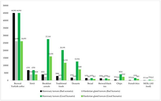 According to the good and bad scenarios, the MOEc values of the foods ranged from 1304 (757)–44,941 (26,095) and 222 (129)–44,941 (26,095), respectively. The limit values for MOEc (mammary tumors (Harderian gland tumors)) are 310 (180) [22]. Accordingly, the consumption of all foods except French fries was found to be safe in terms of carcinogenicity. According to the total daily acrylamide exposure levels, the MOEc values of the bad scenario (111 (64)) were lower than the reference values, which means that there are carcinogenic health risks. The good scenario (all food) was evaluated as safe in terms of carcinogenicity.
