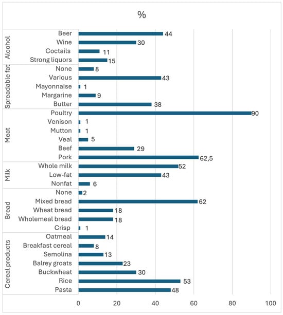 It was also important to determine the specific types of products that were most frequently selected from the distinguished food groups. The type of products chosen, such as the most frequently consumed type of meat, determines whether this dietary component can be considered recommended or discouraged. A breakdown of the types of products chosen by respondents is shown in Figure 2.