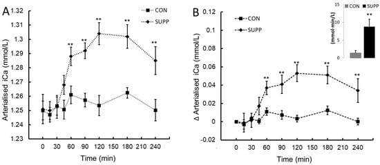 Ionised calcium (iCa; panel (A)) and the change in ionised calcium from baseline (∆iCa; panel (B)) following ingestion of plant-sourced marine multi-mineral + plant-sourced protein isolate (SUPP) or mineral water (CON). The insert in panel (B) reports the integrated area under the curve (AUC0–240) of the change from baseline. Data are the mean (SEM). ** Significant difference between SUPP and CON, p < 0.05.