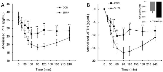 Parathyroid hormone (PTH; panel (A)) and the change in parathyroid hormone from baseline (∆PTH; panel (B)) following ingestion of plant-sourced marine multi-mineral + plant-sourced protein isolate (SUPP) or mineral water (CON). The insert in panel (B) reports the integrated area under the curve (AUC0–240) of the change from baseline. Data are the mean (SEM). ** Significant difference between SUPP and CON, p < 0.05.