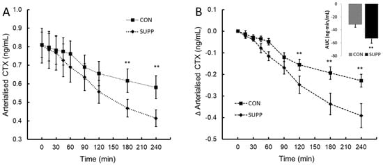 C-terminal peptide of type I collagen (CTX; panel (A)) and the change in CTX from baseline (∆CTX; panel (B)) following ingestion of plant-sourced marine multi-mineral + plant-sourced protein isolate (SUPP) or mineral water (CON). The insert in panel (B) reports the integrated area under the curve (AUC0–240) of the change from baseline. Data are the mean (SEM). ** Significant difference between SUPP and CON, p < 0.05.