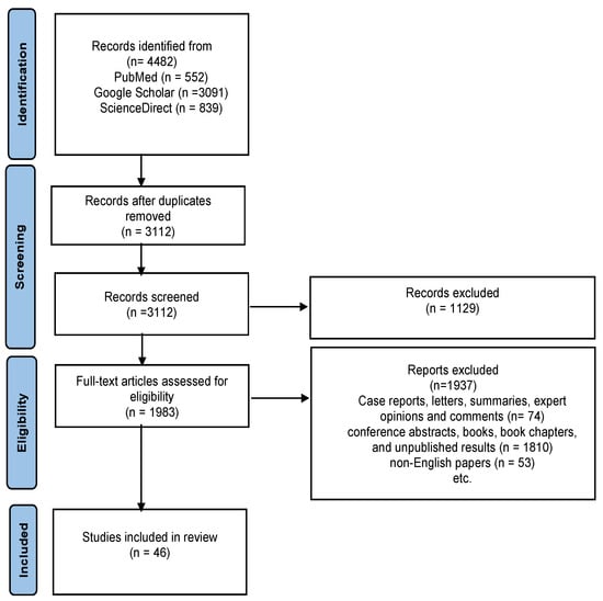 Finally, 46 articles were included in this study, as shown in the diagram of the literature search and selection process (Figure 1). Due to the heterogeneity of the studies, narrative synthesis was deemed the most suitable approach. The results are summarized in three tables that address oxidative stress biomarkers in ADHD, different types of micronutrients, and their possible effects, with a focus on oxidative stress and micronutrient supplementation in individuals with ADHD.