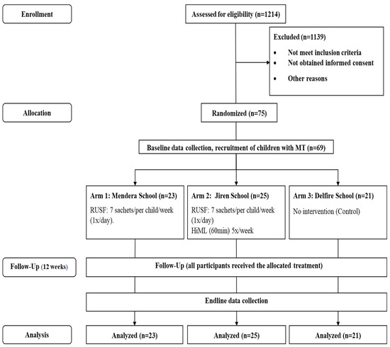 A cluster-randomized controlled trial was conducted using a three-arm parallel group design. First, the schools were randomly selected, and then, within these schools, children were randomly selected among the eligible children for the study. The trial adhered to CONSORT guidelines for cluster-randomized trials [44] and was conducted in school settings to promote collective participation. Clusters (schools) were randomized to minimize intervention contamination and for logistical convenience. The three arms included were as follows: arm 1—moderately thin children receiving RUSF; arm 2—moderately thin children receiving RUSF + HiML; and arm 3—the control group (moderately thin children receiving no intervention).