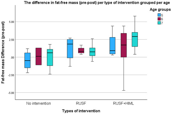 Comparisons of fat-free mass difference per type of intervention grouped per age among children aged 5–7 years in Jimma Town, 2023.