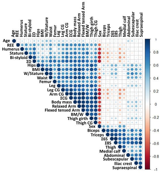 Draftsman correlation plot. Positive correlations are shown in blue, while negative correlations are depicted in red. The intensity of the colors and the size of the circles are proportional to the correlation coefficients. ∑CG: sum of corrected girths (arm + thigh + calf); ∑D: sum of breadths (humerus + bi-styloid + femur); ∑6S: sum of six skinfolds; ∑8S: sum of eight skinfolds; BM/W: body mass-to-waist ratio; CG: corrected girth; REE: resting energy expenditure; W/Stature: waist-to-stature ratio.