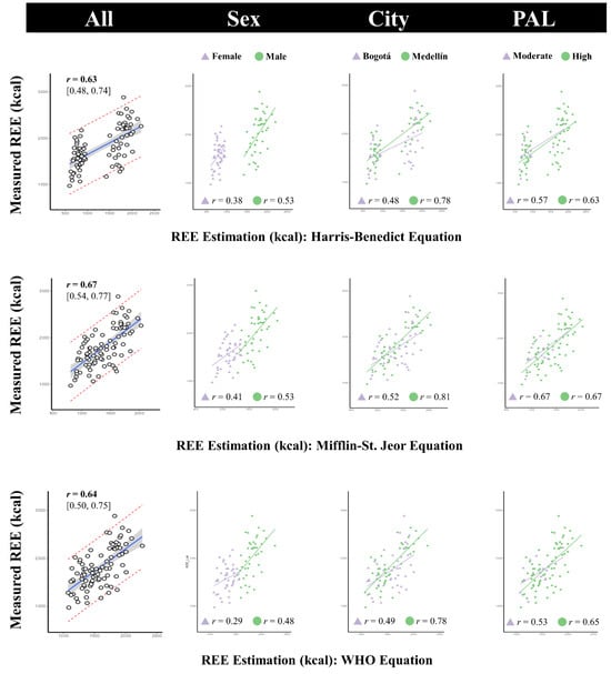 Correlation plots between measured REE (indirect calorimetry) and estimated REE with different equations. The figure also displays the correlation coefficients (Pearson’s r) by sex, city, and physical activity level (PAL).