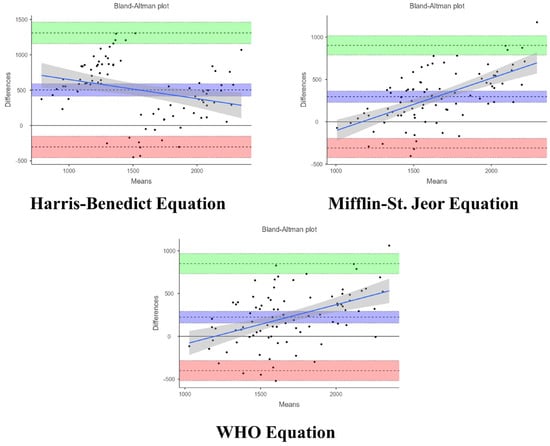 Additionally, aware of the technical differences between basal metabolic rate and REE, we evaluated the validity of equations widely utilized in clinical practice: Harris–Benedict [31], Mifflin–St. Jeor [12], and the “Food and Agriculture Organization of the United Nations/World Health Organization/United Nations” (WHO) equation [32].