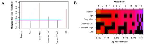 Our additional Bayesian method for selecting the optimal regression model employed Zellner–Siow prior distributions for the regression coefficients to evaluate all Bayes factors against the null model, with potential predictors ranked by their probability from highest to lowest (Figure 4). This analysis allowed us to identify an alternative model with lower performance but simpler to estimate REE, including only body mass and ∑8S (r = 0.724, R2 = 0.525, aR2 = 0.511, RMSE = 282.16 kcal). This simpler equation is reported as the fast NRGCO equation (SEE = 288.32 kcal) as follows: GER (kcal) = 641.482 + (21.433 * BM [kg]) − (2.702 × ∑8S [mm]).