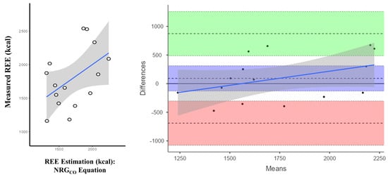 Correlation and concordance analysis of the NRGCO equation. Correlation plot (left) and Bland–Altman plot (right) for differences between measured and estimated REE in kilocalories with the developed equation (NRGCO). Individual differences between real and estimated values are plotted against the mean of the values of measured and estimated REE. Bias (blue), upper (green), and lower (red) limits of agreement with their corresponding confidence intervals as well as the regression fit of the differences on the means (as solid blue line) are shown.