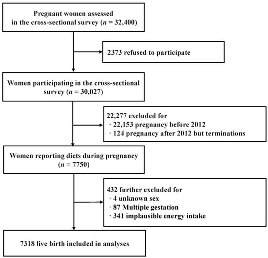 A cross-sectional epidemiological survey aiming to investigate the risk factors of birth outcome was conducted between August and December 2013 in Shaanxi Province, Northwest China. Infants born during 2010–2013 and their mothers were recruited using a stratified multistage random sampling method; detailed descriptions of the study protocol were available elsewhere [13,14], but briefly, this was performed according to the proportion of the rural–urban distribution and fertility rates in Shaanxi Province, China. Initially, twenty counties and ten districts were randomly selected. Subsequently, six villages from each of six townships in the counties, and six communities from each of three streets in the districts were chosen at random. Finally, thirty individuals were sampled from each village, and sixty from each community. Women of childbearing aged 15–49 were recruited for retrospective interviews to collect data on sociodemographics, reproductive history, and periconceptional folic acid and dietary intake using a family questionnaire. Birth outcome data were sourced from medical birth records. Of the 32,400 pregnant women surveyed, 30,027 (92.7% response rate) completed the questionnaire. Exclusions were made for those with pregnancies before 2012 (n = 22,153), or after 2012 with termination (n = 124). A total of 7750 women were further interviewed to report dietary intake during the periconceptional period. An additional 432 were excluded due to unknown sex (n = 4), multiple gestations (n = 87), or implausible energy intake (<500 or >3500 kcal/d, n = 341) [15]. The final analysis included 7318 live births, with exclusion criteria detailed in Figure 1.