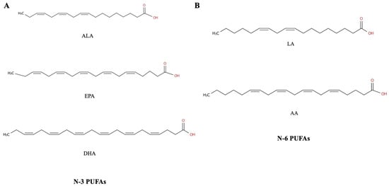 The chemical structures of several polyunsaturated fatty acids: (A) structures of n-3 PUFAs and (B) structures of n-6 PUFAs. AA—arachidonic acid; ALA—α-linolenic acid; DHA—docosahexaenoic acid; EPA—eicosapentaenoic acid; LA—linoleic acid; PUFA—polyunsaturated fatty acid.