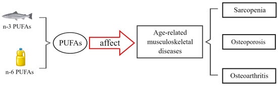 Although the effects and mechanisms of PUFAs on sarcopenia, osteoporosis, and osteoarthritis have been widely studied, the relative information has not been comprehensively summarized and discussed. This paper reviews the studies in recent decades on the potential relationship between PUFAs and several age-related musculoskeletal diseases (sarcopenia, osteoporosis, and osteoarthritis). Then, we also discussed the underlying molecular mechanisms of the effect of PUFAs on these diseases (Figure 2). This review aims to provide a reference for managing and preventing these diseases.