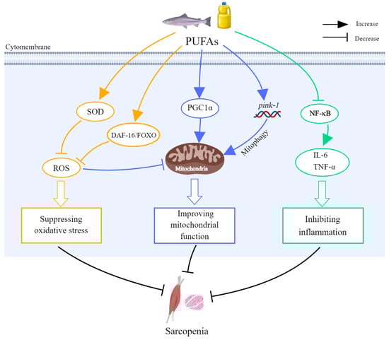 The effects and mechanisms of PUFAs against sarcopenia. PUFAs could increase the level of SOD and the expression of DAF-16/FOXO transcription factors in cells to inhibit the production of ROS, thus suppressing oxidative stress. PUFAs could also improve mitochondrial function by increasing the expression of the mitophagy gene pink-1 and increasing PGC1α to promote mitophagy. PUFAs had the ability to suppress NF-κB activities, hence decreasing inflammatory markers like IL-6 and TNF-α. DAF-16—decay accelerating factor-16; FOXO—forkhead box O; IL-6—interleukin-6; NF-κB—nuclear factor-κ-gene binding; PGC1α—peroxisome proliferator-activated receptor γ coactivator 1α; PUFA—polyunsaturated fatty acid; ROS—reactive oxygen species; SOD—superoxide dismutase; TNF-α—tumor necrosis factor-α.
