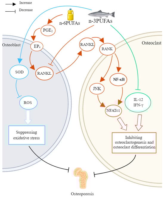 Several animal experiments showed that a diet high in n-3 PUFAs significantly improved bone accumulation and bone function. For example, in a study, 12-month-old mice were given 1% or 4% highly purified concentrated fish oil (CFO) diets for 12 months. The results showed that mice from the 4% CFO group maintained higher bone mineral density (BMD) in the process of aging []. The possible mechanisms of the protection included decreasing the levels of the bone resorption marker (e.g., TRAP and IL-6), reducing the stimulating factor RANKL without influencing its receptor OPG, increasing the suppressors of osteoclastogenesis (e.g., IL-12, interferon-γ, IFN-γ), and downregulating the inflammatory signaling pathways like NF-κB, JNK, and p38 MAPK []. In another study, supplementation of DHA in SD rats increased BMD and bone mineral content (BMC) of the whole body, lumbar spine, and long bone, and the bone cortical microstructure parameters and peak force of the lumbar spine were improved. Additionally, this study also found that during and after sexual maturation, intake of dietary DHA (0.1, 0.4, 0.8, and 1.2% w/w) would contribute to the peak bone mass, and higher doses of DHA had no further healthy benefit for bone []. Furthermore, adult Wistar rats in the group with diets that added flaxseed flour, which is rich in ALA, had greater total and spine BMD, total and spine BMC, and total bone area, as well as higher levels of osteocalcin. Flaxseed flour also improved the width of the diaphysis, BMD, maximum force, breaking strength, and stiffness of the femur []. However, n-6 PUFAs in the diet could be harmful to bone health. For instance, in a study, mice in the postmenopausal osteoporosis model were orally administered with krill oil or AA-rich oil diet. It found that AA diet inhibited BMD and the repair of trabecular microstructure. The underlying mechanism was that the AA diet upregulated the expression of RANKL mediated by prostaglandin E2/EP4 receptor, thereby enhancing the NF-κB pathway, which leads to bone resorption []. The mechanisms of PUFAs on osteoporosis are shown in Figure 4 and Table 3. It should be pointed out that the relationship between osteoporosis and n-3, n-6 PUFAs was inconsistent. That is, taking significant amounts of n-3 PUFAs in the diet was both healthy and safe, whereas too much n-6 PUFAs in the diet could be damaging to health.