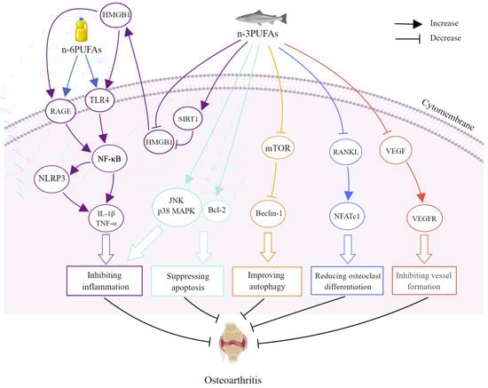 The effects and mechanisms of polyunsaturated fatty acids against osteoarthritis. n-3 PUFAs could increase SIRT1 and inhibit the HMGB1-RAGE/TLR4-NF-κB signaling pathway, while n-6 PUFAs could promote the pathway, which was associated with increasing the level of NLRP3 and inflammatory factors, like IL-1β and TNF-α. n-3 PUFAs could increasing JNK, p38 MAPK pathways expression and Bcl-2 to suppress apoptosis. n-3 PUFAs could raise the level of Beclin-1 by inhibiting the expression of the mTOR pathway to promote autophagy. n-3 PUFAs could lower the expression of RANKL and NFATc1 to suppress osteoclast differentiation and reduce VEGF and its receptor to inhibit vessel formation. Bcl-2—B-cell lymphoma-2; HMGB1—high-mobility group box 1; IL-1β—interleukin-1β; JNK—c-Jun N-terminal kinase; MAPK—mitogen-activated protein kinase; mTOR—mammalian target of rapamycin; NF-κB—nuclear factor-κ-gene binding; NFATc1—nuclear factor of activated T-cells cytoplasmic 1; NLRP3—NOD-like receptor protein 3; PUFA—polyunsaturated fatty acid; RAGE—receptor for advanced glycation end products; RANKL—receptor activator of nuclear factor κB ligand; SIRT1—sirtuin 1; TLR4—toll-like receptor 4; TNF-α—tumor necrosis factor-α; VEGF—vascular endothelial growth factor; VEGFR—vascular endothelial growth factor receptor.
