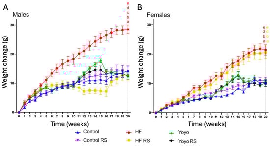 Body weight change in male (A) and female mice (B). Weight change of mice fed control (blue), HF (red), yoyo (green), control RS (purple), HF RS (yellow), and yoyo RS (black) diets. RS supplemented in an HF diet (HF RS) significantly lowered body weight change in male mice compared to an HF diet alone, but no significant difference was observed in female mice. n = 7–8/group/sex; statistic at week 20 p ≤ 0.05 versus a control, b control RS, c HF RS, d yoyo, and e yoyo RS mice. HF—high fat; RS—resistant starch.