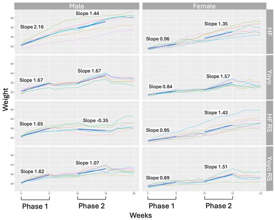 Rate of weight regain of male and female mice in high-fat and yoyo groups, supplemented with and without resistant starch, during two non-restricted (high-fat) feeding periods: Phase 1 (weeks 0–5) and Phase 2 (10–15). The weight of each animal is represented by an individual coloured line. The difference in the rate of weight gain between the 2 phases was identified as the difference in the average slopes of the same-coloured lines in Phase 1 and Phase 2. Bold blue solid lines indicate the average rate of weight gain/loss in Phase 1 and Phase 2 per diet group, respectively. In male mice, across the two HF feeding phases, yoyo mice had a significantly greater rate of weight gain compared to HF mice. RS supplementation in HF and yoyo diets (HF RS and yoyo RS) resulted in significantly lower rates of weight gain compared to diets supplemented with no RS. In female mice, across the two HF feeding phases, HF and yoyo mice had similar rates of weight gain. RS supplementation did not affect the rate of weight gain in female mice. HF—high-fat diet; RS—resistant starch.