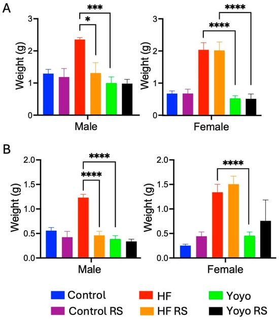 With RS supplementation in the second phase of the yoyo diet (yoyo RS) (black), there was no significant difference in gonadal and perirenal fat mass compared to the yoyo group (Tukey’s HSD: male p > 0.9999 (Figure 4A) and p = 0.9978 (Figure 4B), female p > 0.9999 (Figure 4A) and p = 0.8847 (Figure 4B), respectively). Gonadal and perirenal fat mass between male yoyo RS mice and male HF RS mice did not differ (Tukey’s HSD: p = 0.8332 (Figure 4A) and p = 0.9469 (Figure 4B), respectively). However, gonadal fat mass in female yoyo RS mice was significantly lower than in HF RS mice (Tukey’s HSD: p < 0.0001 (Figure 4A).
