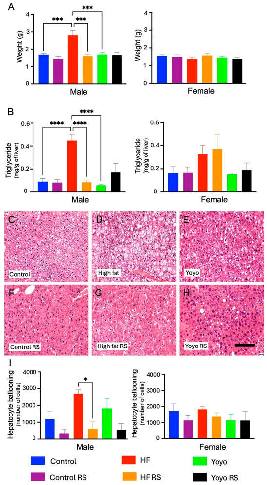 With RS supplementation in the second phase of the yoyo diet (yoyo RS) (black), there were no significant differences in liver mass, liver triglycerides, and hepatocyte ballooning compared to the yoyo group (Tukey’s HSD: p > 0.9999 (Figure 5A), p = 0.9994 (Figure 5B), and p = 0.2437 (Figure 5E,H,I), respectively) and between the yoyo RS and HF RS groups (Tukey’s HSD: p = 0.9999 (Figure 5A), p > 0.9999 (Figure 5B), and p = 0.5663 (Figure 5G–I), respectively).