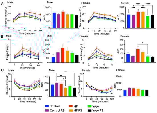 In male mice, there was no significant difference in glucose and insulin levels during an OGTT, and glucose levels during an ITT between the HF (red) and control (blue) groups (two-way ANOVA diet × RS status, p = 0.0664 (Figure 6A), p = 0.1893 (Figure 6B), p = 0.0004 (Figure 6C); Tukey’s HSD: p = 0.9545, p = 0.1468, p = 0.9702, respectively) and between the yoyo and control groups (Tukey’s HSD: p = 0.7229, p = 0.8876, p = 0.7367, respectively). Yoyo dieting (green) appeared to improve blood glucose homeostasis compared to continuous HF feeding; however, this was not significantly different (Tukey’s HSD: p = 0.2536 (Figure 6A), p = 0.6849 (Figure 6B), p = 0.3299 (Figure 6C), respectively). In female mice, HF mice had significantly higher glucose tolerance (two-way ANOVA diet × RS status, p < 0.0001; Tukey’s HSD: p = 0.0006 (Figure 6A)) but similar insulin levels during an OGTT (two-way ANOVA diet × RS status, p = 0.004; Tukey’s HSD: p = 0.1906 (Figure 6B)) and glucose levels during an ITT (two-way ANOVA diet × RS status, p = 0.0234; Tukey’s HSD: p = 0.0502 (Figure 6C)) compared to control mice. There was no significant difference in glucose homeostasis and plasma insulin between the yoyo and control groups (Tukey’s HSD: p = 0.1312 (Figure 6A), p > 0.9999 (Figure 6B), p = 0.8399 (Figure 6C), respectively). Yoyo dieting significantly lowered glucose and insulin levels during an OGTT, but not ITT, compared to HF mice (Tukey’s HSD: p < 0.0001 (Figure 6A), p = 0.0286 (Figure 6B), p = 0.2294 (Figure 6C), respectively).