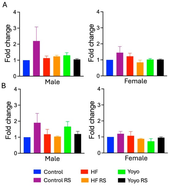 After 20 weeks, regardless of sex and RS status, yoyo mice (green) had similar gonadal and perirenal fat mass compared to control mice (blue) (two-way ANOVA diet × RS status: male p = 0.0232 and female p < 0.0001; Tukey’s HSD: male p = 0.8784 (Figure 4A) and p = 0.9858 (Figure 4B); female p = 0.9816 (Figure 4A) and p = 0.8352 (Figure 4B), respectively) and were significantly lower than HF mice (red) (Tukey’s HSD: male p = 0.0002 (Figure 4A) and p < 0.0001 (Figure 4B), female p < 0.0001 (Figure 4A) and p = 0.0173 (Figure 4B), respectively).
