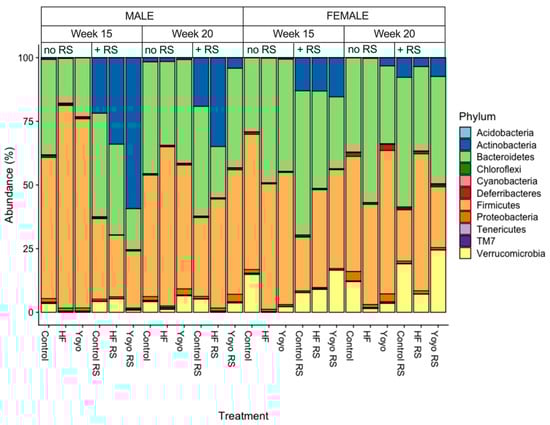 Supplementation with RS in a control diet (control RS) was associated with a greater relative abundance of Actinobacteria compared to a control diet only (Figure 8, male, week 15: 21.8% versus 0.63%, week 20: 19.09% versus 1.6%; Figure 8, female, week 15: 12.9% versus 0.05%, week 20: 7.73% versus 0.09%). Likewise, RS supplementation in an HF diet (HF RS) was also associated with enriched Actinobacteria compared to an HF diet only (Figure 8, male, week 15: 33.9% versus 0.26%, week 20: 34.9% versus 1.5%; Figure 8, female, week 15: 13.08% versus 0.15%, week 20: 3.46% versus 0.21%).