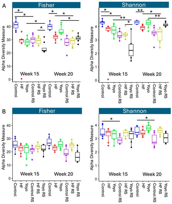 Alpha diversity. Fisher’s and Shannon’s diversity indices of faecal samples of male (A) and female mice (B) in week 15 and week 20. The median is illustrated by the horizontal line inside the box. The lowest and highest values within 1.5 times the interquartile range from the 1st and 3rd quartiles, respectively, are illustrated by whiskers. * p ≤ 0.05, ** p ≤ 0.01, with n = 6–8/group/sex. Boxes represent the interquartile range between the first and third quartiles. The horizontal line inside the box illustrates the median. Solid dots (●) outside the whiskers indicate greater than 1.5 times and less than 3 times the interquartile range. Graphs were generated from raw and untrimmed data. HF—high-fat diet; RS—resistant starch.