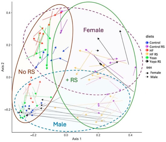 Principal coordinate analysis (PCoA)—beta diversity. Bray–Curtis ordination plot showing the dissimilarity of the gut microbiota from mice fed six different diets at two time points (weeks 15 and 20). The microbiota profiles of different dietary treatments are represented by different colours: blue (control), purple (control RS), red (HF), yellow (HF RS), green (yoyo), and black (yoyo RS). Solid arrows represent female mice, and arrows with dashed lines represent male mice. The tail of an arrow indicates microbiota composition in week 15, while the tip of an arrow indicates microbiota composition in week 20. RS—resistant starch; HF—high fat.