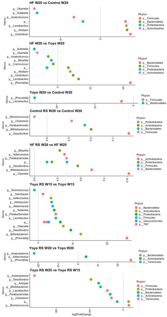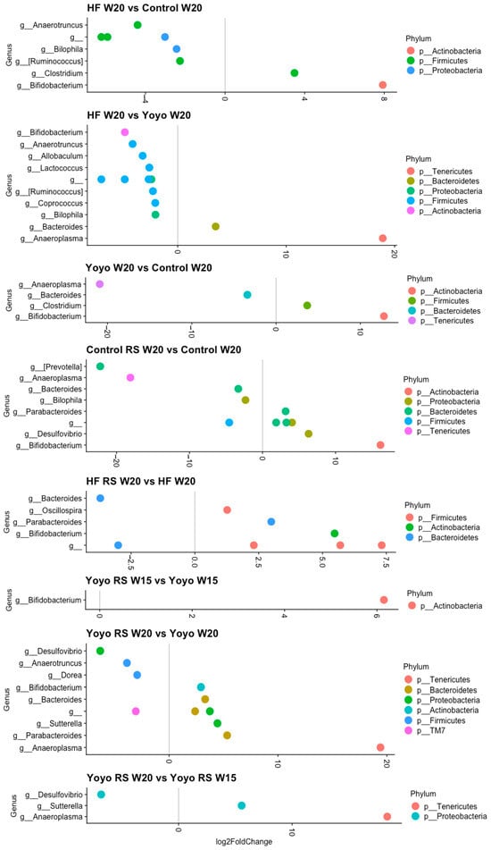 In males, RS supplementation in the second phase of the yoyo diet (yoyo RS) resulted in 15 differentially abundant genera (Figure 11 and Figure 12). In particular, yoyo RS mice had enriched Parabacteroides (log2FC = 5.08), Bifidobacterium (log2FC = 12.35), Desulfovibrio (log2FC = 9.46), Lactobacillus (log2FC = 5.09), and Adlercreutzia (log2FC = 3.71) but reduced Ruminococcus (log2FC = −1.12) compared to yoyo mice. Interestingly, at the end of the dietary intervention, we only observed three differentially abundant genera in yoyo RS mice compared to yoyo mice, including Prevotella (log2FC = 26.63), Anaeroplasma (log2FC = −22.18), and Adlercreutzia log2FC = 4.02) (Figure 11). On the other hand, in female mice, we observed 11 differentially abundant genera between yoyo RS and yoyo mice. Particularly, yoyo RS mice had significantly enriched Bifidobacterium (log2FC = 6.15), Parabacteroides (log2FC = 5.33), and Bacteroides (log2FC = 3.31) but reduced Desulfovibrio (log2FC = −6.32) and Dorea (log2FC = −2.93) compared to yoyo mice (Figure 12).